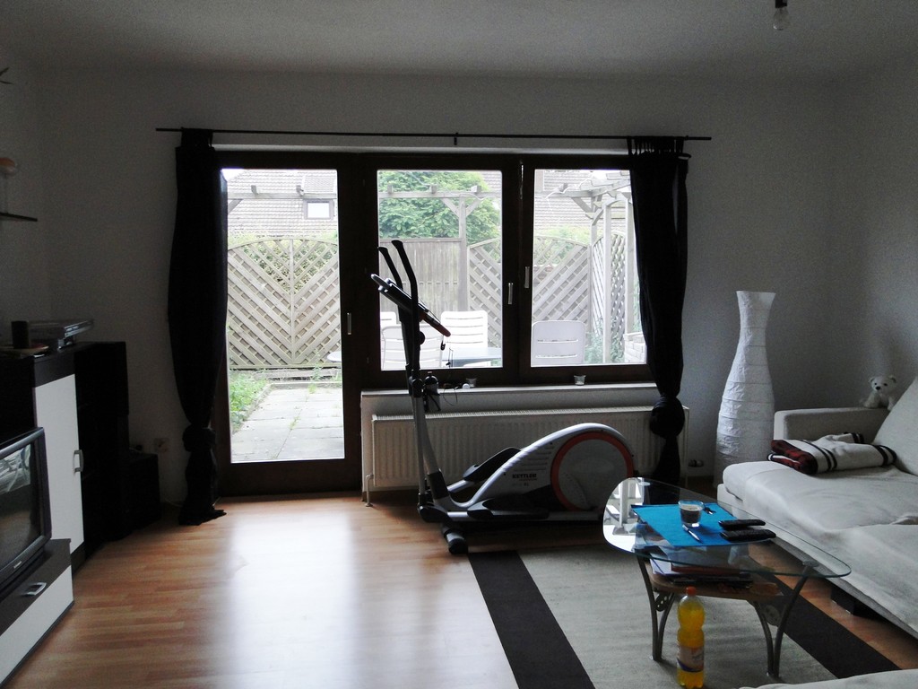 Im EG befindet sich das lichtdurchflutete Wohnzimmer, ausgestattet mit neuem Laminatfußboden, von hier aus geht es direkt auf die sonnige Terrasse. Die Küche mit Abstellraum und ein