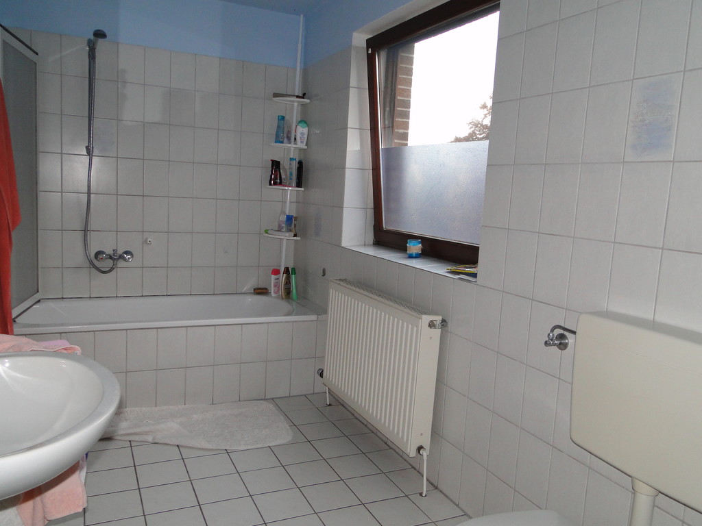 Im OG befindet sich ein Schlafzimmer, ebenfalls mit neuem Laminatfußboden ausgestattet. Im Tageslichtbadezimmer sind weiße Sanitärobjekte, Waschbecken, Toilette und Badewanne mit hellen Fliesen. Ein