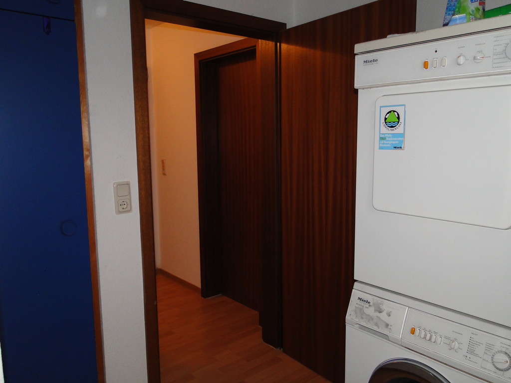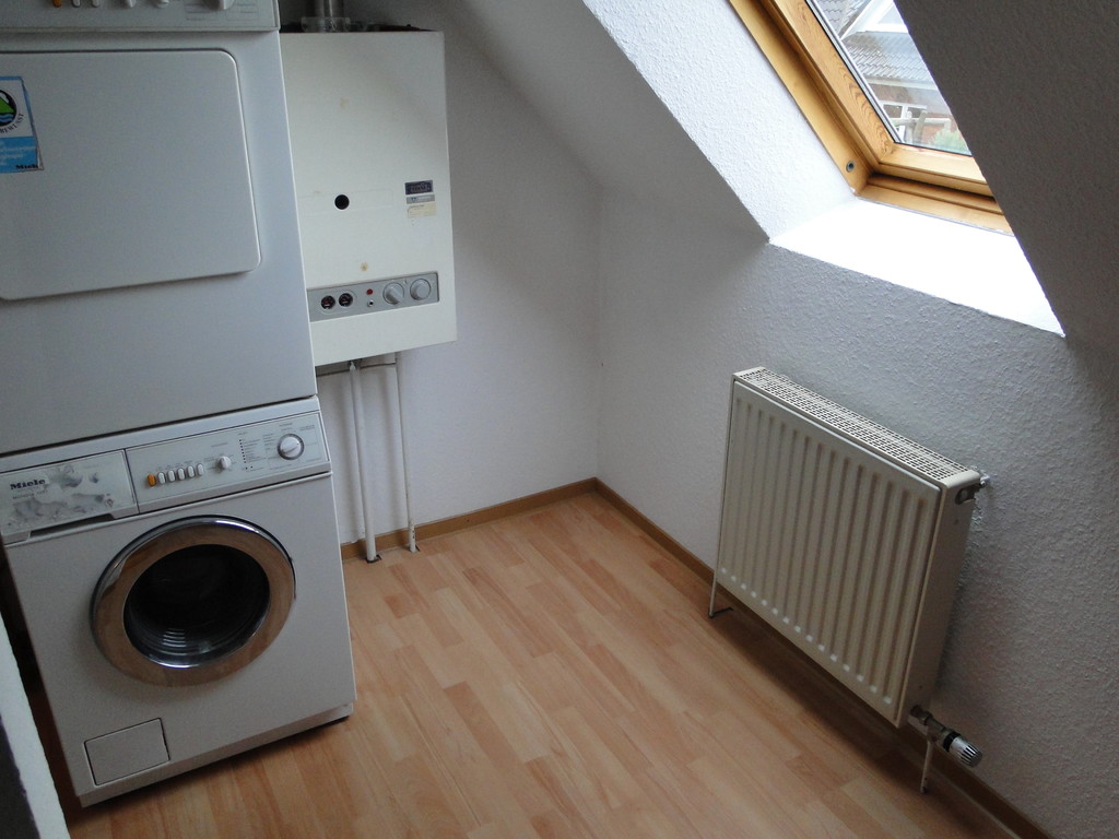 Hauswirtschaftsraum mit Heizung und Anschlüsse für Waschmaschine und Trockner. Von hier aus führt eine Holztreppe direkt nach oben in das Studiozimmer, auch hier wurde der Fußboden mit neuem Laminat