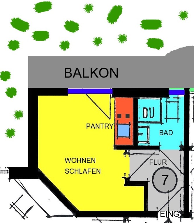 Kleines schnuckeliges 1-Zimmer-Appartement mit integrieter Pantry- Küche und einem schönen Balkon.