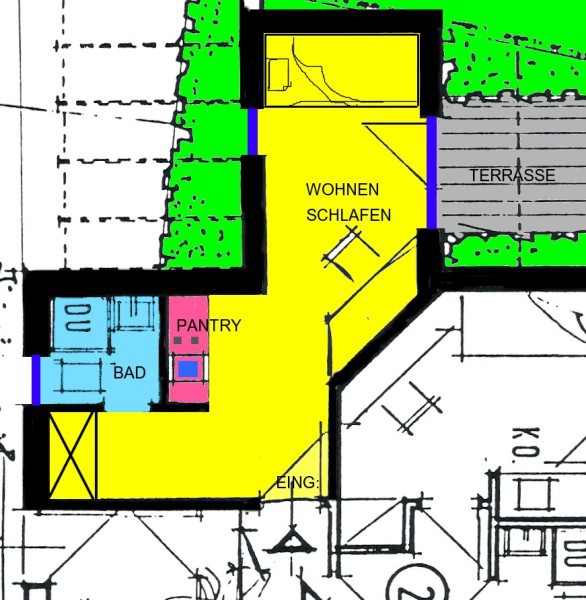 VERMIETET !!! Kleines schnuckeliges 1-Zimmer-Appartement mit integrieter Pantry- Küche und einer schönen Terrasse.